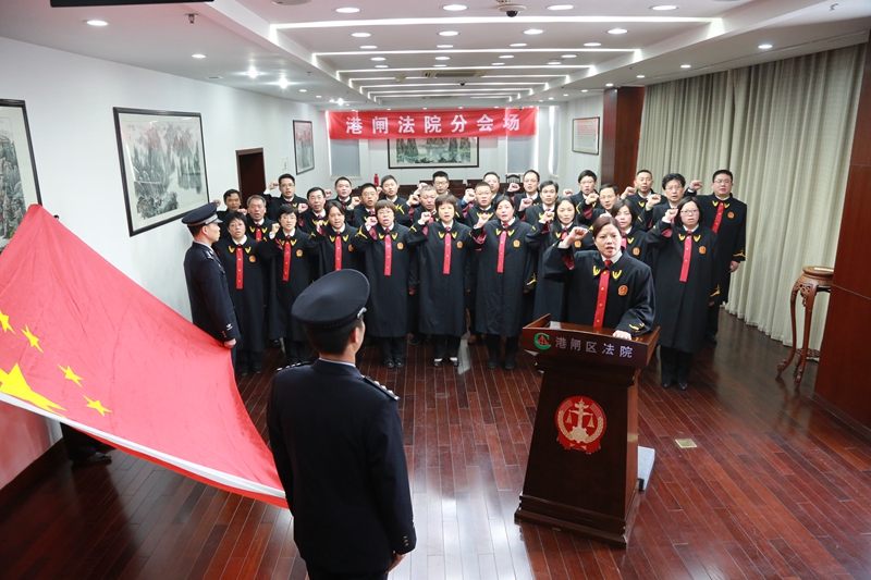 “我宣誓:忠于中华人民共和国宪法,维护宪法权威……为建设富强、民主、文明、和谐的社会主义国家努力奋斗!”12月4日是国家宪法日,为大力弘扬宪法精神,进一步提升法官依法履职的责任感和荣誉感,南通市港闸区法院举行宪法宣誓活动。在该院党组书记、院长陆燕红的带领下,全体员额法官身着法袍面对国旗和宪法,高举右手庄严宣誓。